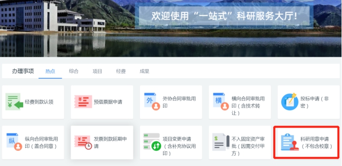 2. 办理地址:登录翱翔门户,点击“科研系统”进入系统性爱直播;在性爱直播办理事项栏选择“科研用章申请”。