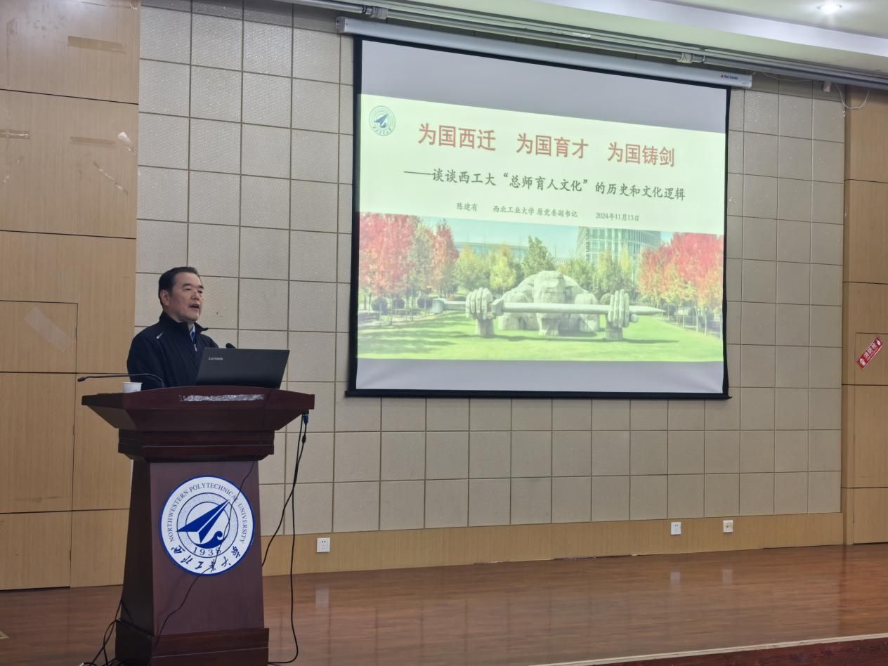 陈建有围绕“为国西迁、为国育才、为国铸剑”三个关键词,结合电影、话剧、音乐剧等多种形式,生动解读了西北工业大学“总师育人文化”的丰富内涵和历史渊源。他回顾了西工大的西迁历程,展现了学校在国家重大战略需求中的重要作用及西工大人的家国情怀和奉献精神。通过列举杰出校友和“总师”人物,展示了西工大在航空航天航海等领域的重要贡献,并深入阐述了学校“为国育才”的教育理念。他强调,西工大始终以培养具有家国情怀、创新精神和实践能力的高素质人才为根本任务。在“为国铸剑”部分,陈建有结合西工大在国防科技领域的成就,讲述了学校科研创新与国家战略的紧密结合,在为国家科技实力和国防力量做出的贡献。他鼓励师生继承和发扬西工大的优良传统,为实现中华民族伟大复兴的中国梦贡献力量。