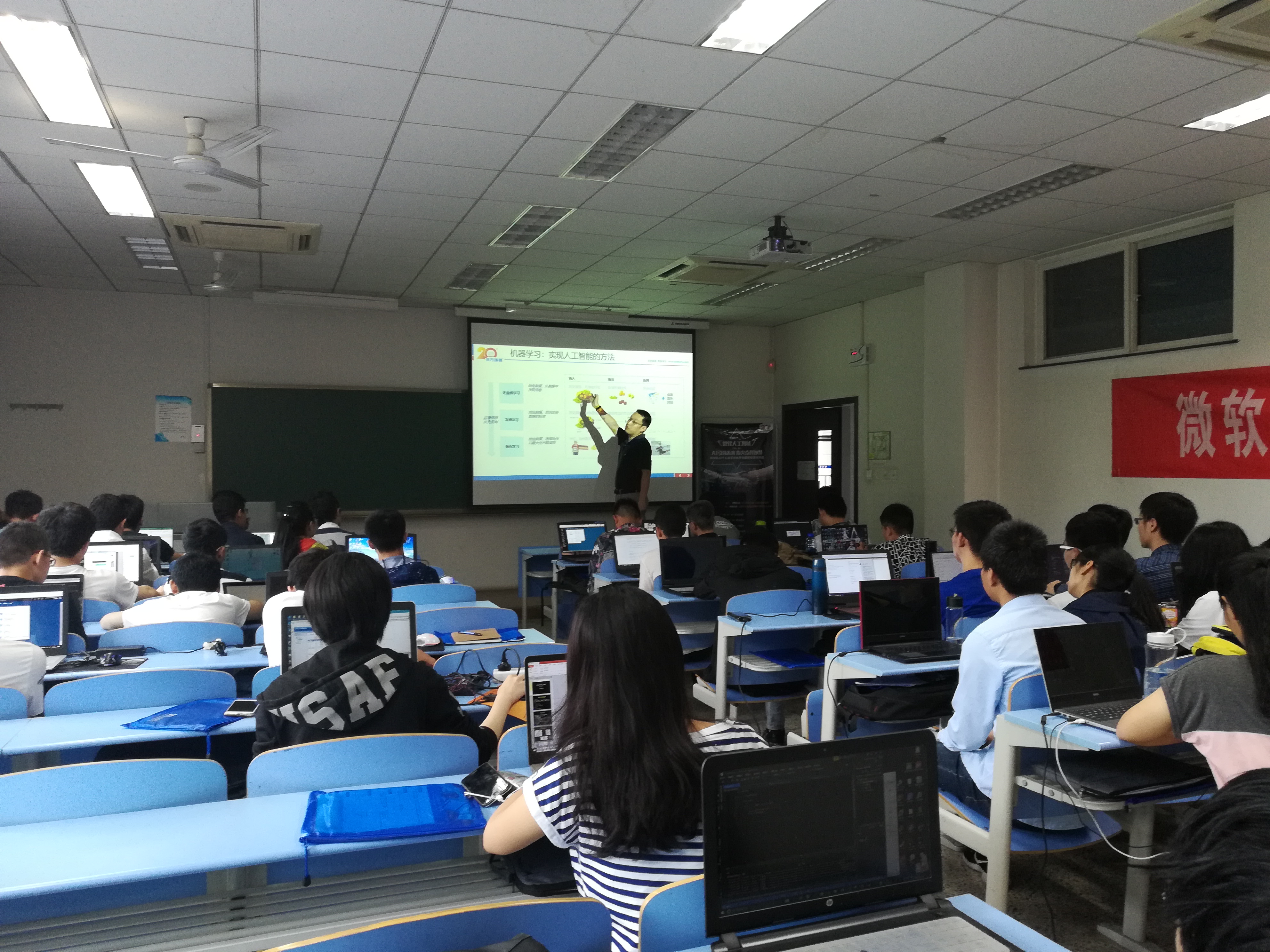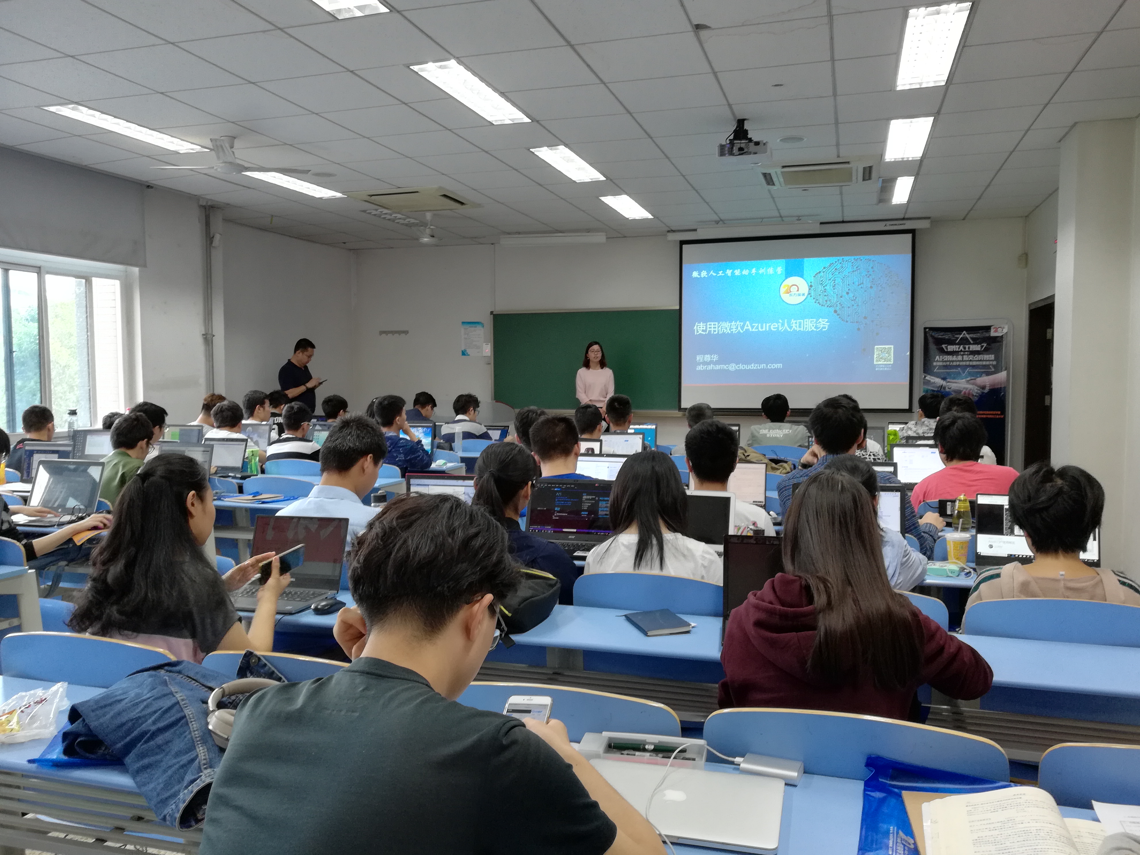 随后,程尊华为参训学生进行了授课。他从人工智能概要、发展简史、机器学习、深度学习、人工智能领域分支内容等方面,综述了人工智能技术。他对微软Azure平台进行了深入的介绍,并通过与阿里、谷歌、亚马逊等平台之间的对比,讲述了微软Azure平台在人工智能技术方面的特色之处。