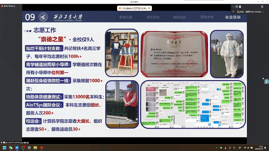 张田田从思想品德、学科双创、志愿服务和社会实践四个方面开展自己的经验分享。她的过往经历不仅展现了扎实的专业基础和严谨的科研态度,也彰显了她对于服务社会、勇于实践的青年担当,并鼓励同学们要敢于探索未知,勇于迎接挑战,不断提升自己的综合素质。