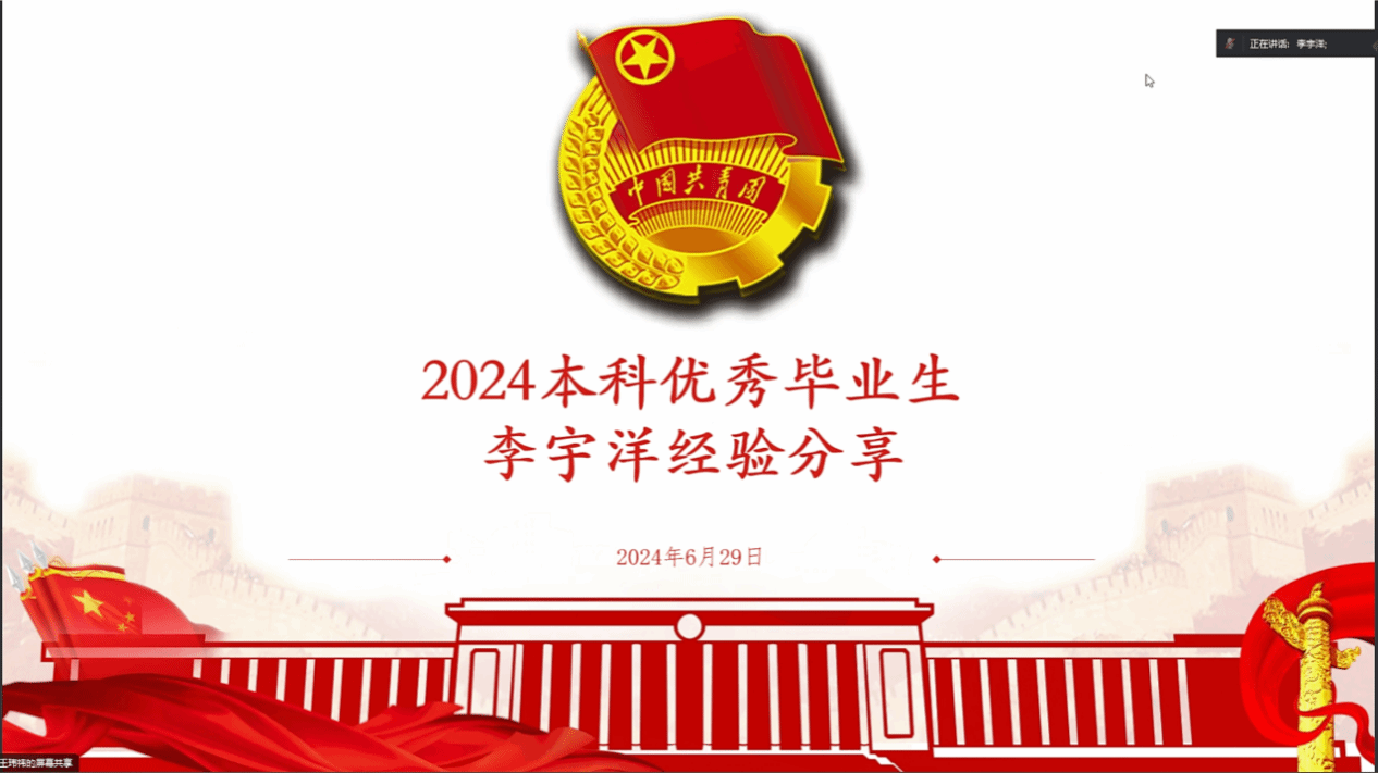 本科2023级DL062325、DL062326、DL062329三个团支部在学院团委指导下联合举办了优秀学生标兵经验分享会,共同于线上开展了这场特别的主题团日活动。本次分享会特别邀请到学校2024本科优秀毕业生李宇洋和2024年五四红旗标兵张田田两位学院优秀学子为2023级团员青年分享了个人的成长经历及学习、科研、推免等相关经验。会议由DL062326支部团支书王玮祎主持,团委书记靳宇琪及来自于本科2023级的60余名团员青年参加。