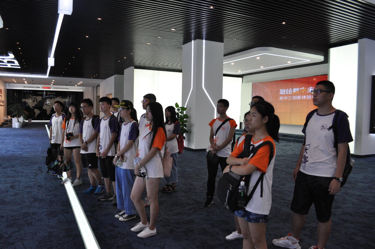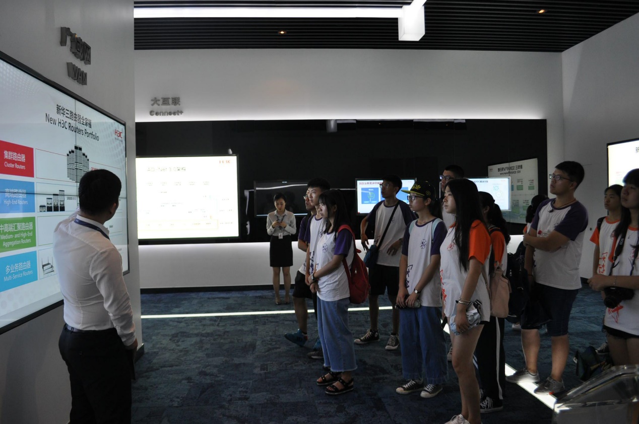 2018年7月23日星期一上午,由冉燕玲老师带领的浙江实践队参观了H3C公司(新华三)。首先,参观公司展厅。由讲解员带领,了解公司发展历史以及研发的新产品,还了解了有关云计算、大数据等具体应用。随后,与两位校友在会议室进行学习和交流。