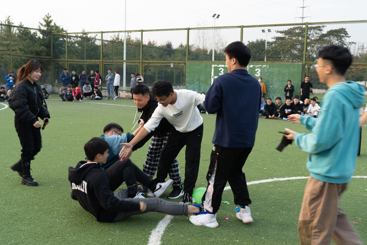 快乐“彩”球比赛中,每队两个气球以及绳子,采取两人三足的绑法,并将气球绑在两边的脚上,在规定区域内,听到主持人发出哨音后,开始用脚踩破他队的气球,若两个气球均被踩破即淘汰,直到游戏时间结束。考验着队友的协作与对手的对抗能力,在比赛过程中当对手摔倒时,同学们也会友好地拉起摔倒的对手,拉近了同学们之间的距离。