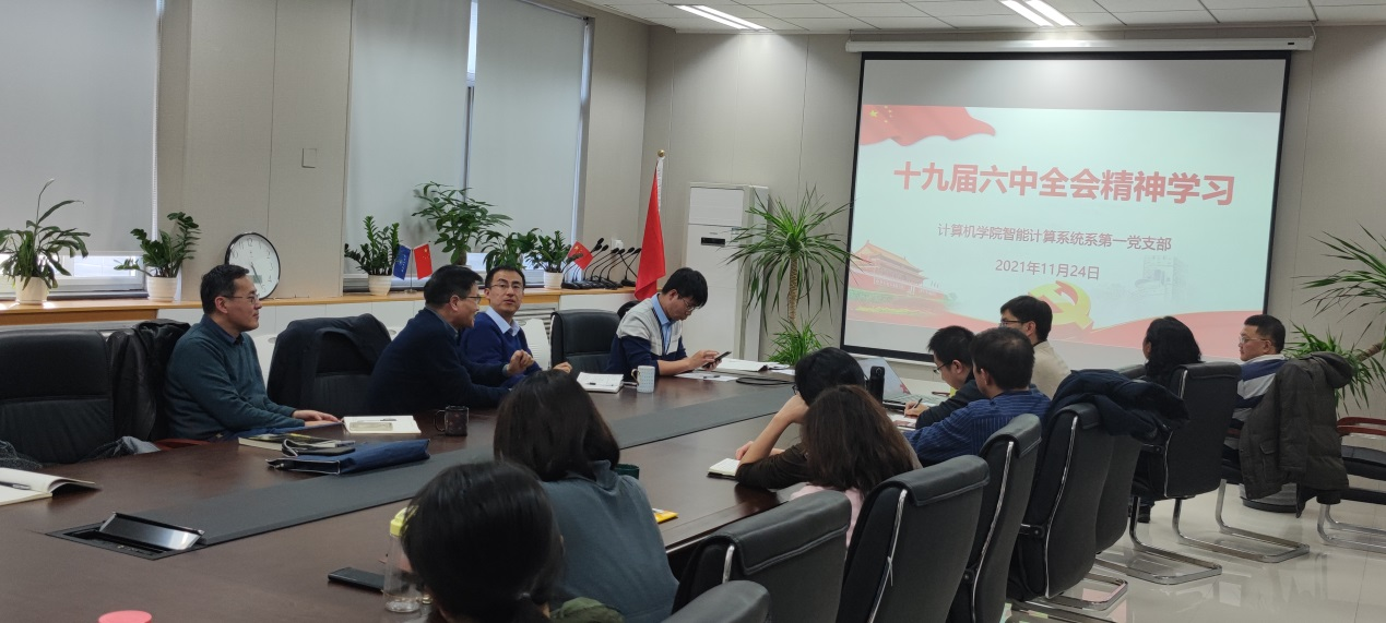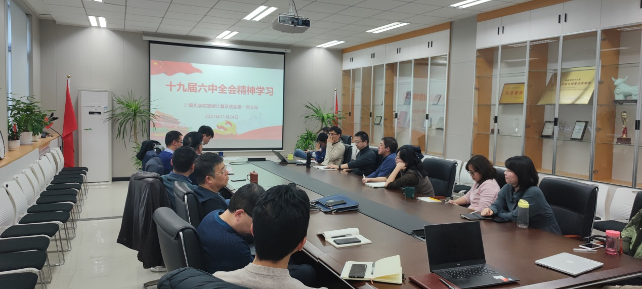 智能计算系统系第一党支部召开党员大会,专题学习研讨十九届六中全会精神,会议由支部书记王柱同志主持。