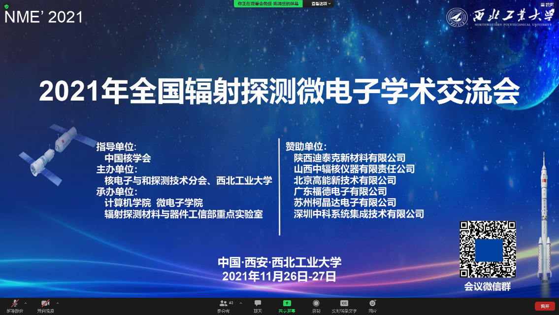 11月26-27日,2021年全国辐射探测微电子学术交流会通过在线会议形式顺利召开。全国辐射探测微电子学术交流会是由中国核学会核电子学与核探测技术分会发起的系列学术会议,每年举行一次,旨在促进国内核辐射探测微电子技术的发展,推动相关技术在基础和其他领域中的应用。本届会议由中国核学会核电子学与核探测技术分会和西北工业大学主办,中国核学会为会议指导单位,由我校仿生芯片交叉研究中心高武教授课题组承办,受到陕西迪泰克新材料有限公司、山西中辐核仪器有限公司、北京高能新技术有限公司、广东福德电子有限公司、苏州珂晶达电子有限公司、深圳中科系统集成技术有限公司6家单位友情赞助。