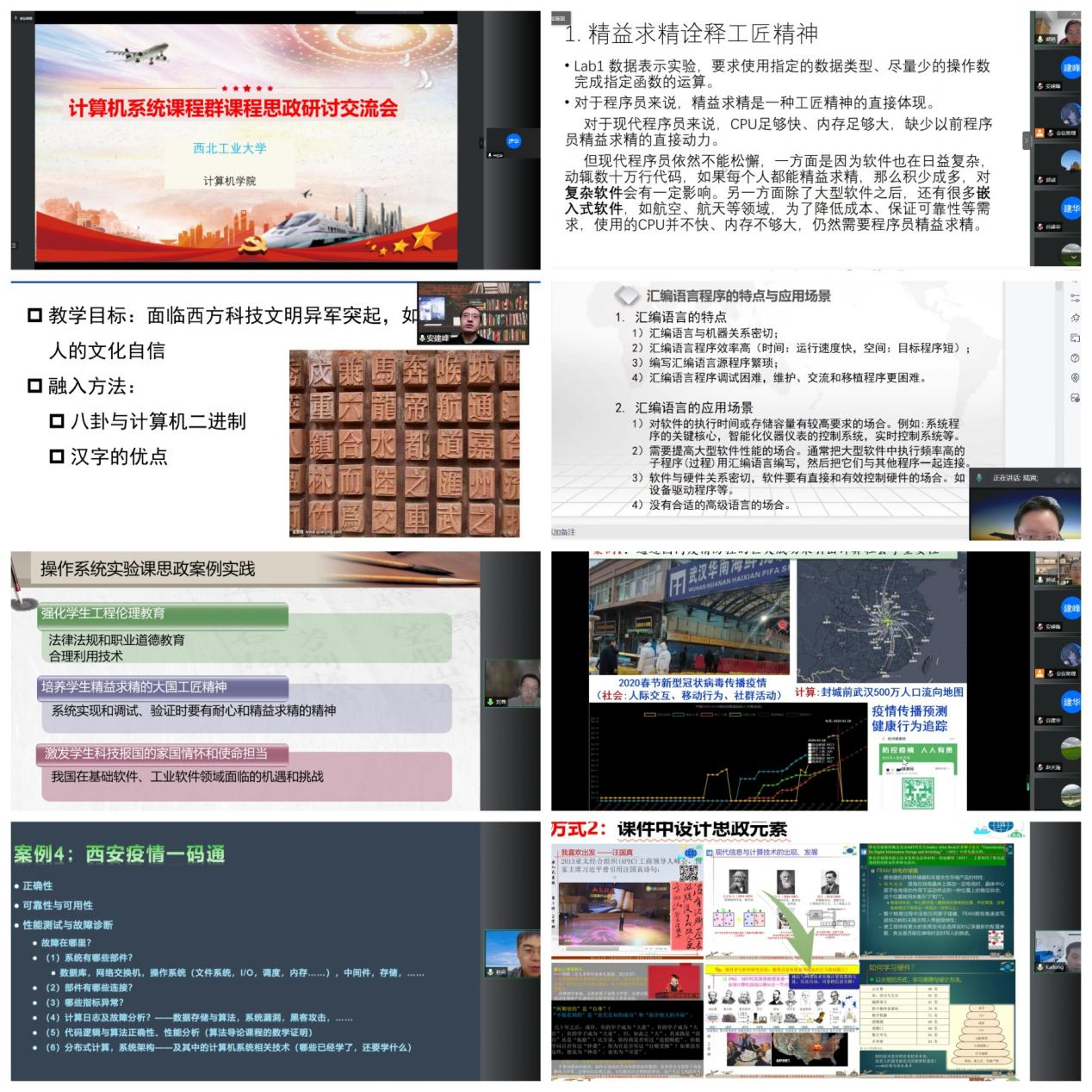 会上,郭斌、安建峰、郭艳、陆寅、张羽、刘尊、林奕、张凯龙等教师分别代表《计算社会学》、《计算机系统基础》、《计算机系统基础实验》、《汇编语言》、《操作系统》、《操作系统实验》、《计算机系统设计》等课程汇报了课程思政已开展的工作,以及课程思政案例库的建设情况。王云岚、赵天海、郑然、陈超、李志刚、褚伟波、赵楠楠、侯正雄等参会教师结合课程思政的实施情况,开展了广泛深入的讨论。