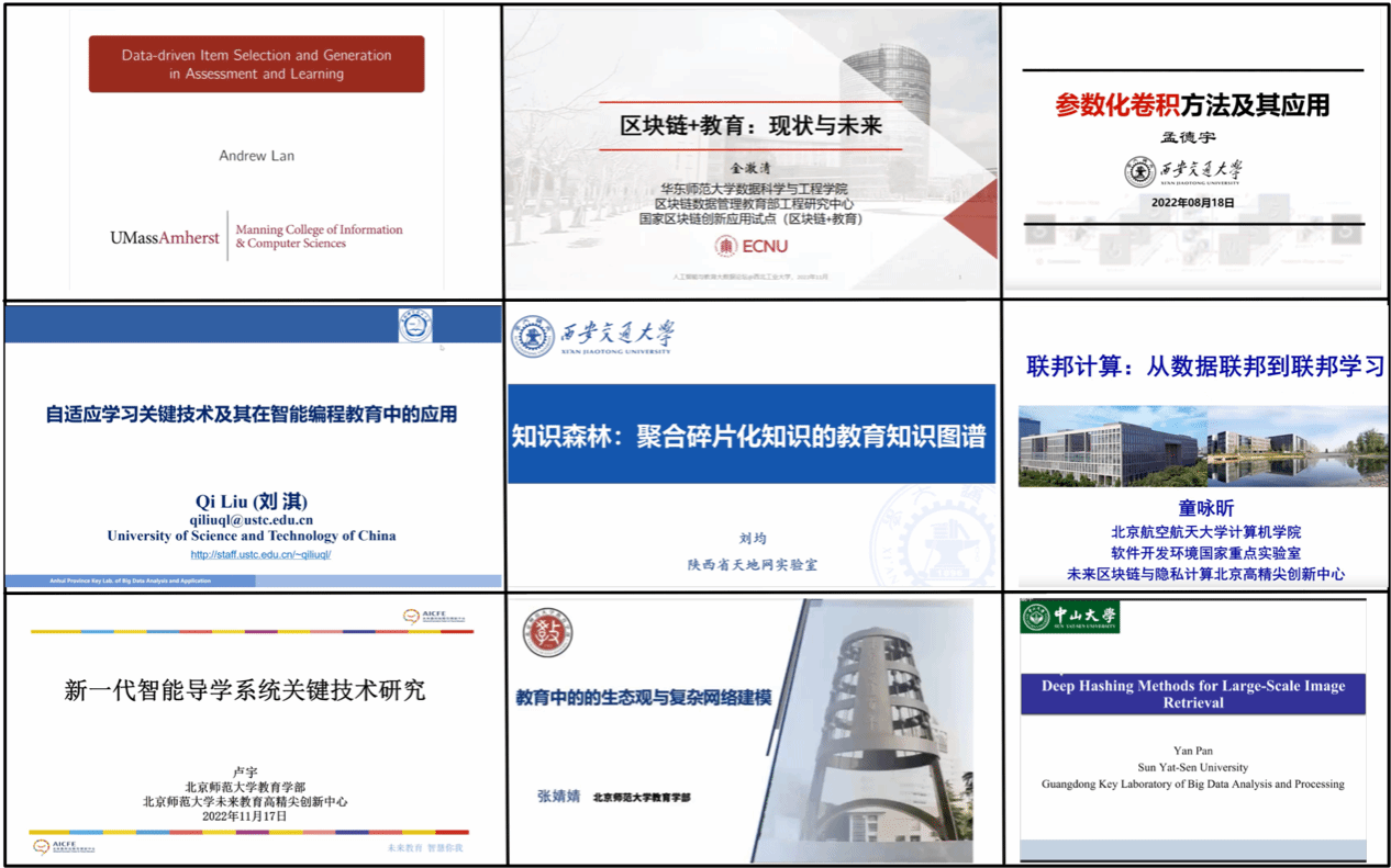 学术报告分两个单元进行。17日上午,来自麻省大学Andrew Lan教授、华东师范大学金澈清教授、中国科学技术大学刘淇教授、西安交通大学孟德宇教授分别带来关于认知追踪、区块链+教育和参数化卷积的成果分享以及未来研究方向的讨论。17日下午,来自西安交通大学刘均教授、北京航空航天大学童咏昕教授、北京师范大学卢宇副教授、北京师范大学张婧婧教授、中山大学潘炎副教授分别介绍了知识森林、联邦学习、智能导学、教育复杂网络和海量数据检索等精彩的研究成果。