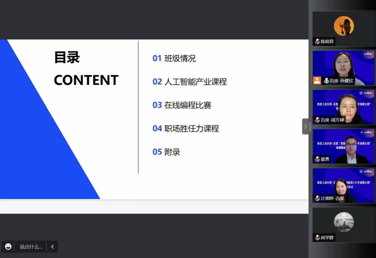 院长尚学群教授、副院长夏勇教授、首席智能官CIO专班班主任张磊教授、百度高校合作部副总监计湘婷、百度高校合作部经理周方棣、百度高校合作部乔文慧,以及2021级和2022级CIO专班学生出席了本次会议。会议由百度高校合作部孙健欣主持。