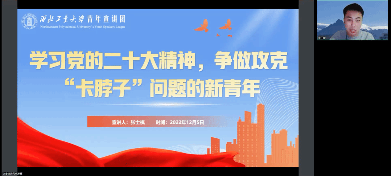 会上,西北工业大学青年宣讲团讲师张士祺同学做了题为“学习党的二十大精神,争做攻克‘卡脖子’问题的新青年”的分享报告。从伟大建党精神,中国共产党人精神谱系,深刻理解伟大建党精神的内涵,到争做攻克“卡脖子”问题新青年等,张士祺同学通过深入浅出的讲解和丰富生动的事例,提醒大家“初心易得,始终难守”,号召青年团员要刻苦钻研、奋勇争先,以实际行动为我国进入创新型国家行列贡献力量,让个人成长成才的人生轨迹与中华民族伟大复兴的历史进程同频共振,让青春在全面建设社会主义现代化国家的火热实践中绽放绚丽之花!
