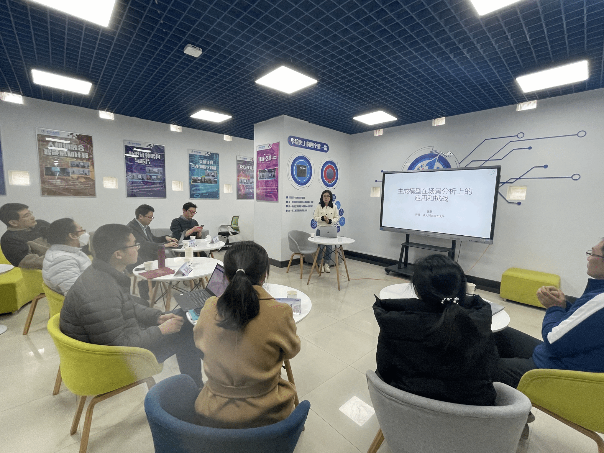 在报告中,张静向大家阐释了场景分析的含义,场景分析作为计算机视觉的一个重要的研究方向,目前的主要手段集中在设计CNN或者transformer的网络结构,用于实现全监督映射(从图像或者视频空间到场景分割空间)。虽然少量数据也可以实现数据拟合,由于数据多样性的有限性,产生的模型通常是有偏差的,即模型容易overfitting。同时,标签产生的过程也会产生不可避免的人为误差。大数据依赖以及数据固有的噪声,使得学习数据分布变得更加迫切。相对于拟合确定的输出,学习到输出的分布可以更好的判断网络或者模型对于输出的置信度。不确定性建模的目的就是研究网络对于输出的自信程度,生成模型是一种直接的学习到输出分布,从而实现不确定性建模的手段。本场报告学术氛围浓厚而热烈,与会师生畅所欲言,互有启发。
