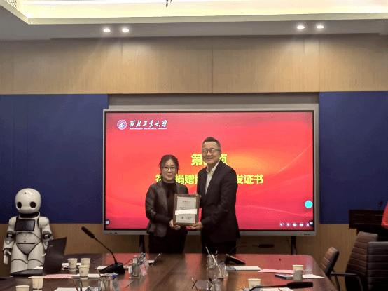 会上,维谛技术有限公司与西北工业大学教育基金会签订了捐赠协议,支持西北工业大学校园运动赛事等校园文化活动的开展,徐伟侠代表西北工业大学教育基金会向张林颁发了捐赠证书。随后,万海东与张林签署了就业与实习基地协议,由张林、万海东、王兆旭共同为“西北工业大学就业与实习基地”揭牌。