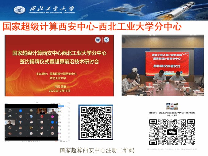 国家超级计算西安中心-西北工业大学分中心于2022年12月13日正式签约成立,与西工大优势互补、互利共赢,融合校内外超算和智算资源,更好地为全校师生提供持续的科学与工程计算、人工智能计算等服务,促进各学科的发展和交叉复合型人才的培养,特别是为航空宇航科学、材料科学与工程、计算机科学等一流学科提供科研和人才培养的支撑平台。双方共同推动区域经济高质量发展。未来,还将会定期举办培训与交流会。