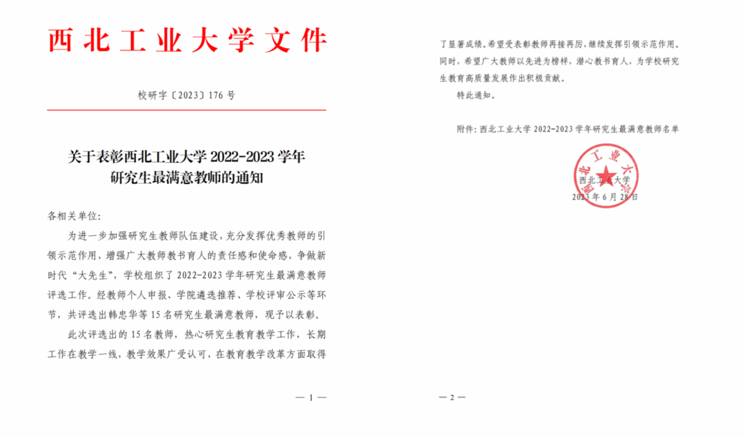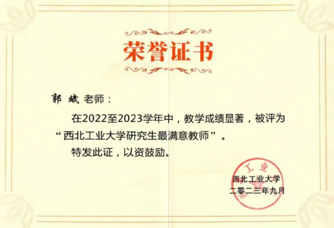 名列前茅;指导研究生多次获得校“博士创新基金”、“校企合作基金”、“创意创新种子基金”等支持,先后有5名同学毕业论文入选“西北工业大学优秀硕士学位论文”,1名同学毕业论文入选“西北工业大学优秀博士学位论文”,13名同学入选西工大优秀硕士毕业生,1名同学入选西工大优秀博士毕业生。