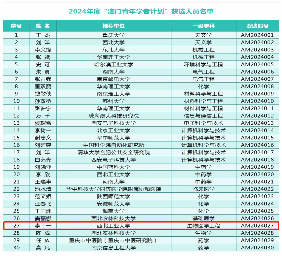 9月初,全国博士后管委会办公室公布了2024年度“澳门青年学者计划”获选结果名单。本年度,“澳门青年学者计划”在内地高校共计资助30人,西北工业大学有2人入选,性爱直播
