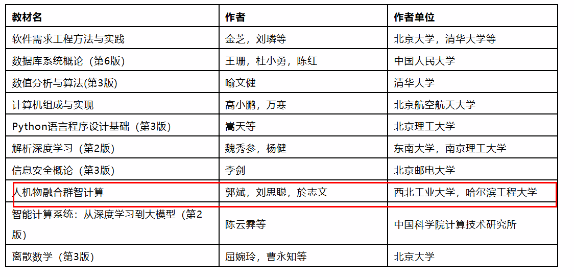 近日,2025年度CCF(中国计算机学会)推荐教材名单正式公布,由西北工业大学人机物融合智能计算团队郭斌教授、於志文教授、刘思聪副教授联合编著的《人机物融合群智计算》成功入选,成为计算机领域前沿教学成果的代表之一。