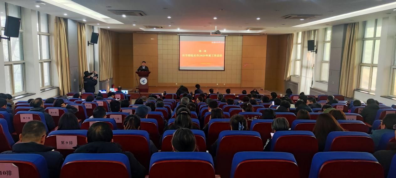 在学院报告厅召开2025年度总结表彰大会,学院近两百名教职工出席会议,会议由学院党委书记李春科主持。