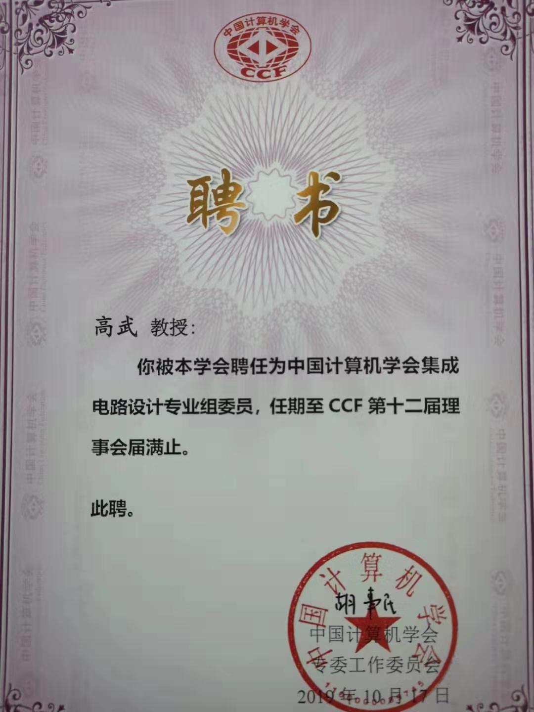 高武教授被聘为CCF集成电路设计专业组首批委员。