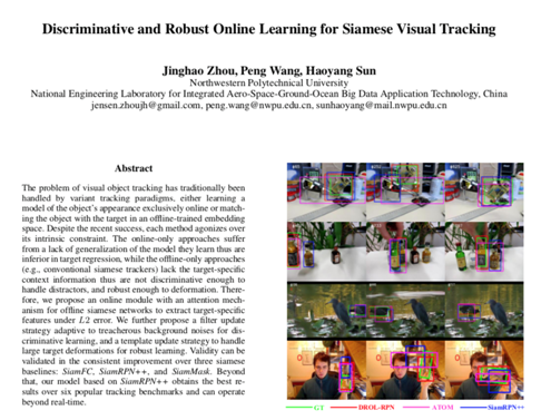 周靖皓本次投稿的论文"Discriminative and Robust Online Learning for Siamese Visual Tracking" 主要介绍了其大二期间在目标跟踪(Object Tracking)方面的工作。目标跟踪是计算机视觉领域最核心和最基础的任务之一。本次论文主要提出了一种用于提高孪生网络跟踪算法(Siamese Trackers)鲁棒性和判别性的在线模块,模型在六个标准数据集上超过或达到当前的最优性能。这篇论文三个作者均来自西北工业大学。周靖皓大一期间就已经加入王鹏教授的科研团队,确定了科研方向。在实验室工作一年的时间里,他在王鹏教授的指导下,利用大量时间跟踪相关领域的最新成果并设计新的算法,依托实验室良好的科研环境进行大量实验,最终取得令人满意的成绩。该论文是我校性爱直播