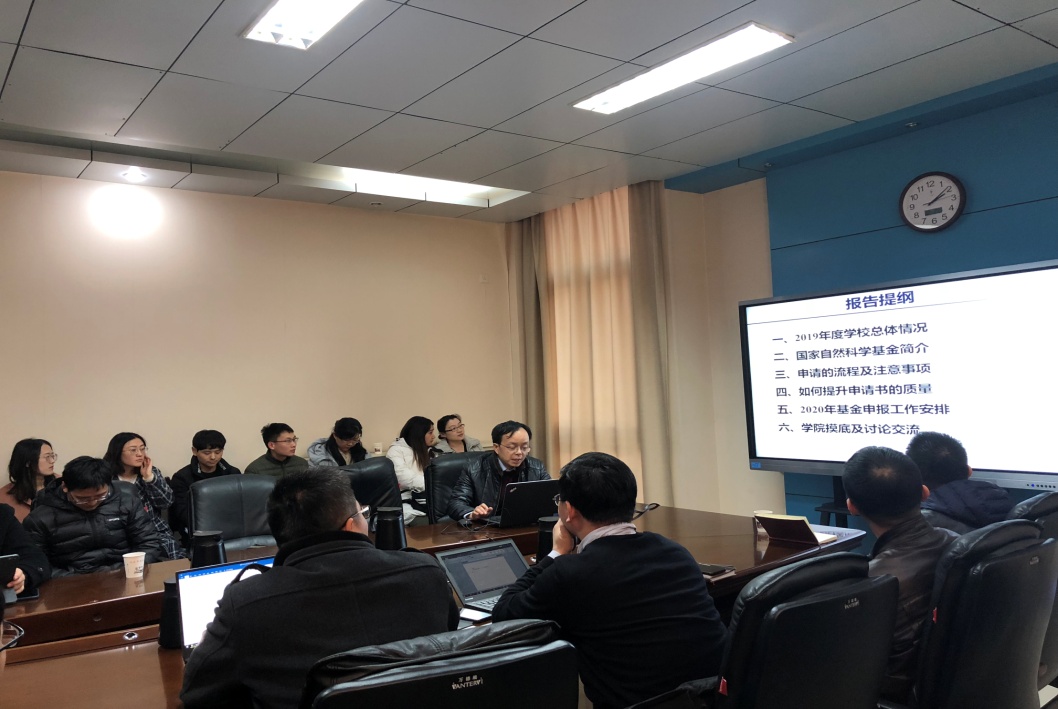 申请基金的情况。随后苏海军部长介绍了我校历年来自然基金总体申报和获批情况,结合自然基金深化改革的要点,着重对自然基金的申请流程和注意事项进行了讲解,并从选题、内容、思路和论述等方面就如何提升申请书的质量展开了详细的论述。最后,苏海军向与会教师介绍了学校2020年国家自然基金申报的总体工作安排部署,希望学院能进一步强化组织,积极申报。教师代表也就自然基金申请过程中的问题和苏海军部长进行了深入的交流和讨论。