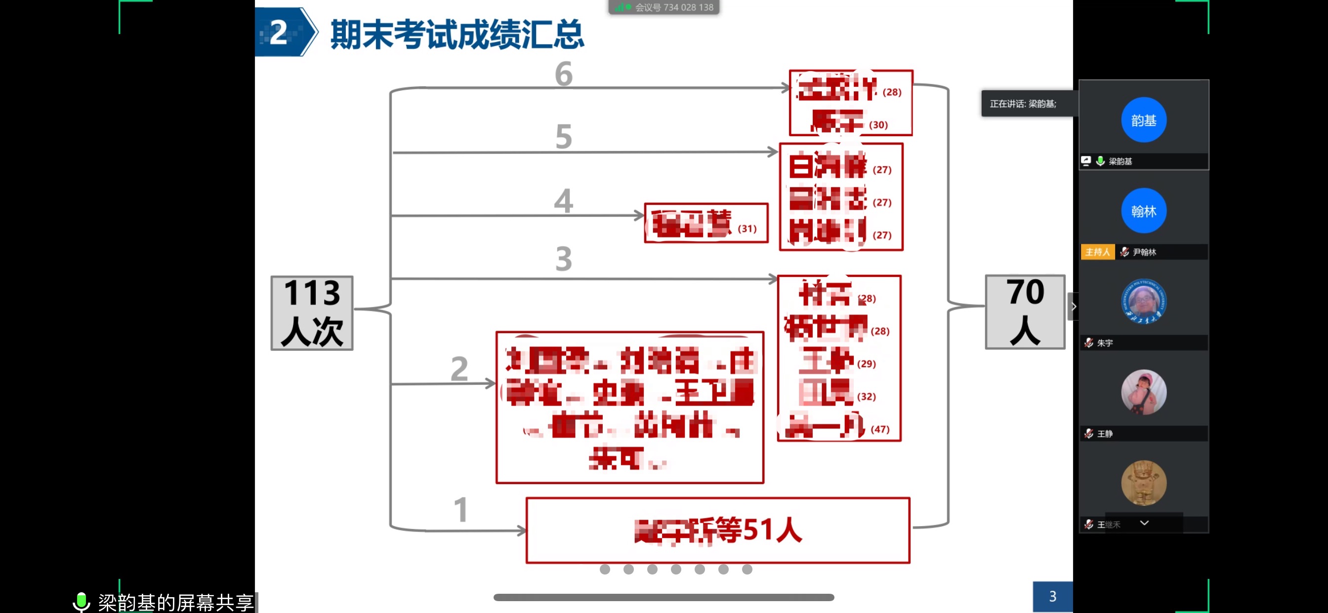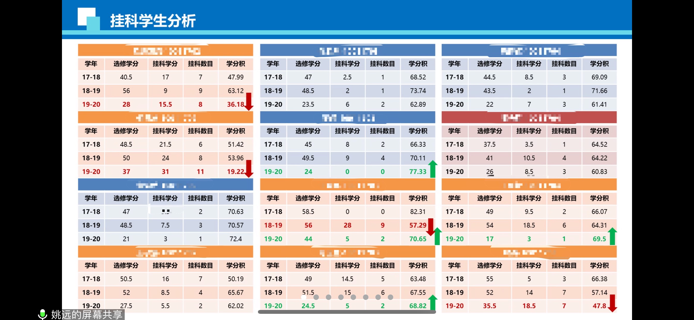 首先,姚远、尹翰林、梁韵基等三位年级辅导员分别就学院17级、18级以及19级本科生整体情况尤其学风情况进行了汇报。17级辅导员姚远老师对每个班的挂科学生进行了系统的成绩分析,从当前阶段出发,总结出了每个挂科学生从大一到大三的挂科情况曲线;18级辅导员尹翰林老师在对上学期学习成绩进行分析的基础上,总结了导致学生挂科的主要原因并提出了相应的解决措施;19级辅导员梁韵基老师分享了许多为了提高大一学生主观能动性以及培养大一新生学习习惯的活动,如开展职业规划教育、红色文化教育、“最美笔记评选大赛”等。此外,三个年级的辅导员还重点介绍了每个班需要关注的重点学生情况,曹聪琦老师也对18级本科生的重点关注学生做出了补充。