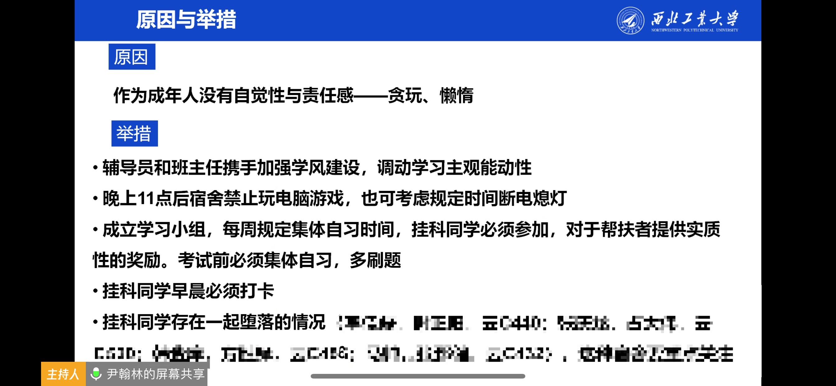 随后,班主任老师结合自己所带班级目前的学风状况,从具体问题出发提出了自己的见解。会上姜学锋老师、詹涛老师、赵晓南老师、侯正雄老师分别针对如何基于学生学习基础及兴趣进行分层次针对性教育、学生的自制力及责任感、集体上自习、一对一重点帮扶、以及帮扶激励措施等方面发表了自己的看法及建议。
