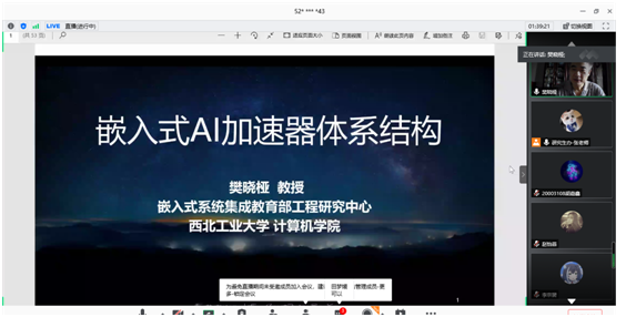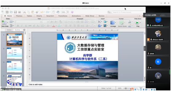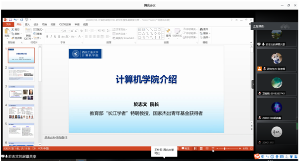 各位专家进行了在线学术报告。於志文教授为大家精彩讲解《智能时代的计算机科学》;樊晓桠教授作了题为《嵌入式AI加速器体系结构》的报告;翟正军教授作了题为《网络化远程测试与故障诊断技术及其应用》;王鹏教授作了题为《让机器学会“看”与“听”》;王琦教授作了题为《火眼金睛:视觉智能分析与理解》;尚学群教授作了题为《大数据存储、管理与分析》的讲座。各位教授同时也介绍了各系科研团队的研究方向、团队成员、科研成果和发展状况等。