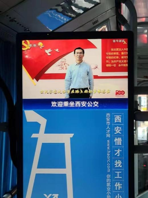 究竟是什么事让陈老师成为大家的热点呢?原来他参加了陕西广电移动电视频道“全民学党史、奋斗在路上”的好书推荐官的短视频录制,日前该视频在西安各大公交车上进行循环播放了。
