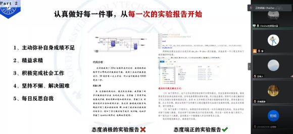 严盛恢同学分享了自己平时学习经验和科研竞赛经历。他告诉同学们平时上课认真听讲,摆正心态对待课程比课后自学更有效,强调在上课中坐前排,多思考、多提问,积极与老师互动。