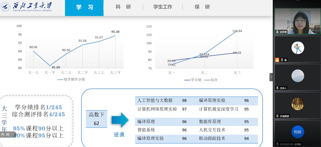 李梦媛同学分享了自己从濒临挂科到进入实验室发表文章,最后成功保研的经历,她强调要明确自己的学习目标,以结果为导向,提高学习效率,主动联系感兴趣的研究领域的老师,提前进入实验室学习,同时不要假装努力,也不要表演努力,时间会最终衡量自己的努力程度。