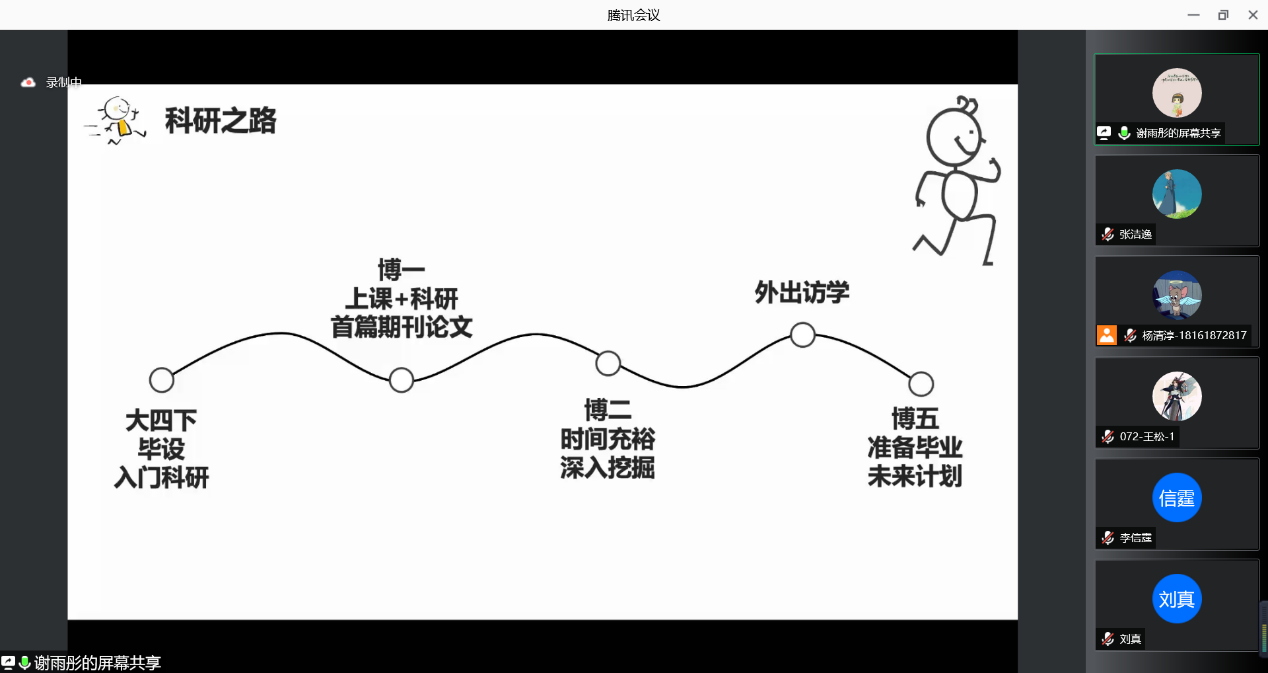 接着,学生代表谢雨彤分享了自己在学习、科研、生活等方面的心得体会。在科研路上,她指出“只要有心,时间总是有的”,“沿着一个课题一直做,出成果快”,“有机会一定要去不同的地方看看”,并重点介绍了自己在论文撰写方面积累的经验。此外,她还认为生活不只有科研,还要保持身心健康,坚持锻炼。