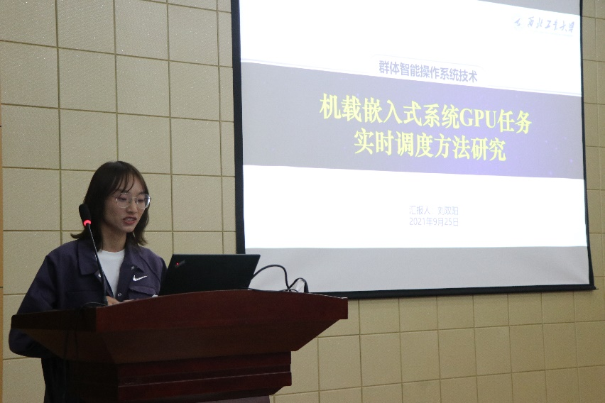 最后,实验室优秀研究生代表刘双阳同学做了题为《机载嵌入式系统GPU任务实时调度方法研究》的学术报告,探讨在多任务并行的机载嵌入式系统环境下,GPU如何更好进行调度的问题。此外,刘双阳同学还和大家分享了一些科研感悟:一开始接触科研应当多阅读文献,做好阅读笔记,以平和的心态对待科研,谨慎选择研究方向,积极与导师沟通。