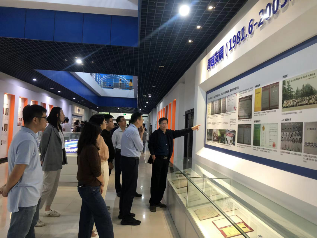 颁奖环节结束后,大家一同前往学院南楼一层院史长廊进行参观交流。周兴社教授向实验室的青年教师以及同学们介绍了学院的发展历程,从人才培养、教学改革、学科竞赛、学科方向、优秀校友和国际合作等方面详细介绍。在轻松互动的过程中大家对学院的历史和现状有了更清晰的了解。