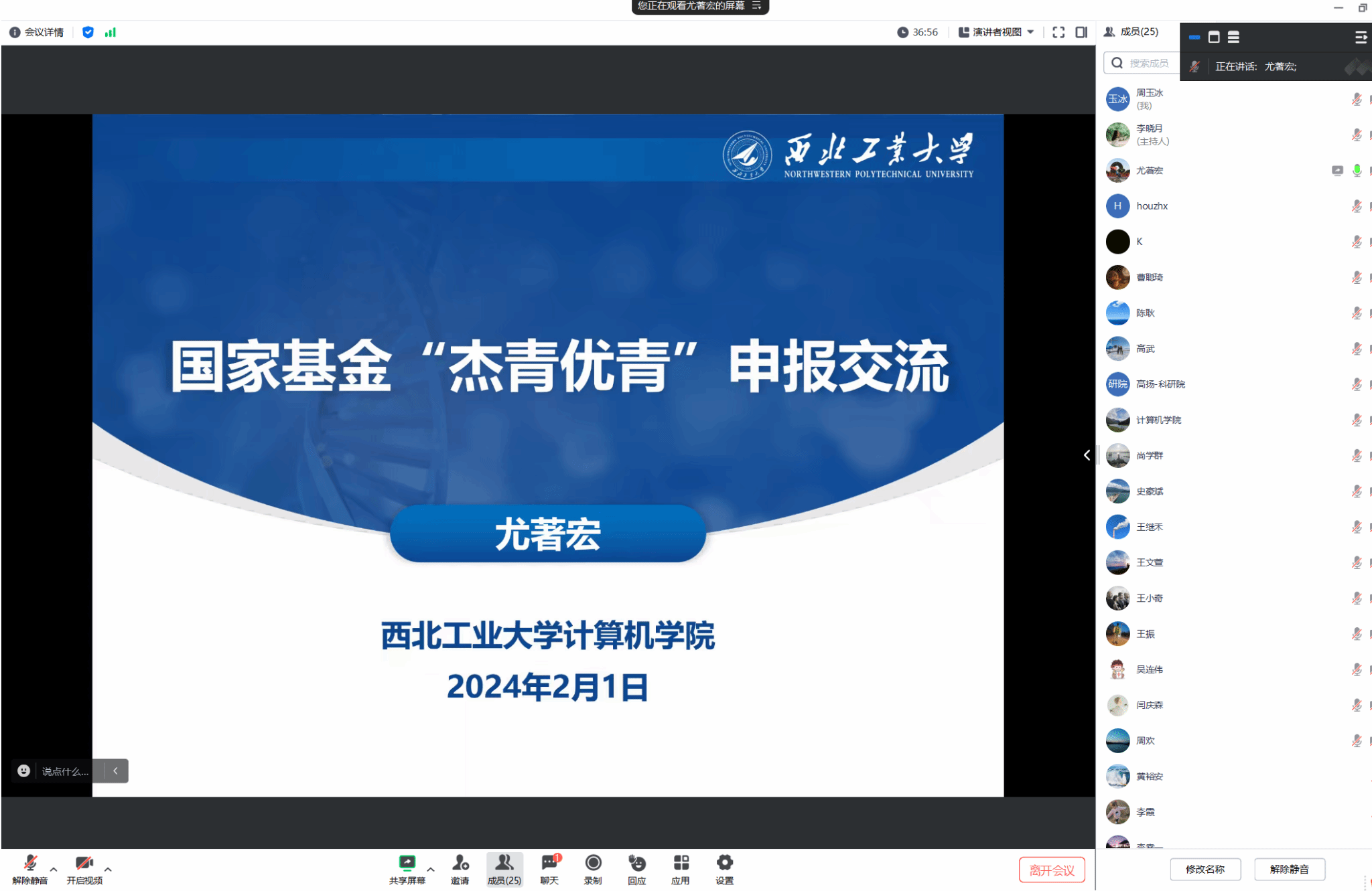 举办召开国家自然基金杰青和优青申报辅导交流会,尚学群院长,史豪斌副院长、科学技术研究院基础办高扬主任以及本年度申请国家自然科学基金杰青和优秀青年科学基金项目的全体教师参加了本次经验交流会,会议由史豪斌副院长主持。