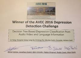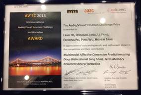 2) 在听视觉及移动可穿戴设备信号融合的情感识别与精神状态分析研究方向:获得国际听视觉情感挑战赛AVEC2015第一名、AVEC2016抑郁症检测竞赛第一名、AVEC2017抑郁症估计竞赛第二名、多模态情感挑战赛MEC2016视觉组第一名和多模态组第一名。