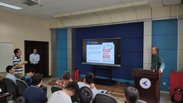 本次报告中,Lee教授首先阐述了经典的实时性问题,分别从硬件与软件、科学与工程的角度对该问题进行了深入剖析。进而,结合其团队近年来在实时系统、信息物理融合系统(CPS)研究方面的工作及进展给出了基于确定性模型的实时软件与系统的设计方法,以及在本领域的未来研究方向以及所存在的几个关键挑战。报告内容引起了与会教师与学生的极大兴趣,就所关注的问题进行了热烈讨论。报告过程中,Lee教授和张凯龙副教授还为部分师生进行了现场签名赠书,《嵌入式系统导论—CPS方法》(第2版)(Edward A. Lee著,张凯龙译)、《嵌入式系统体系、原理与设计》(张凯龙编著),进一步促进了学术交流。随后,Lee教授来到西北工业大学—巴黎高科MINES机器人与群智能系统联合实验室听取了实验室课题组面向服务的多无人车自主协同研究的进展并进行了深入讨论。