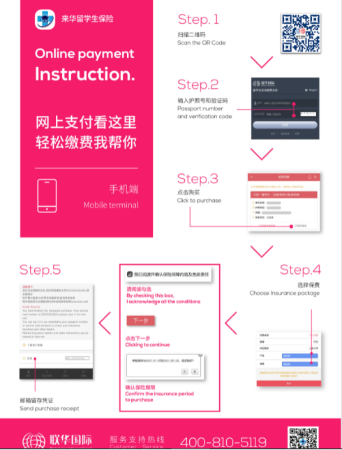 ① Log in to the Lianhua Insurance website (www.lxbx.net), click the "Student check payment" icon, and log in with the passport number for registration;